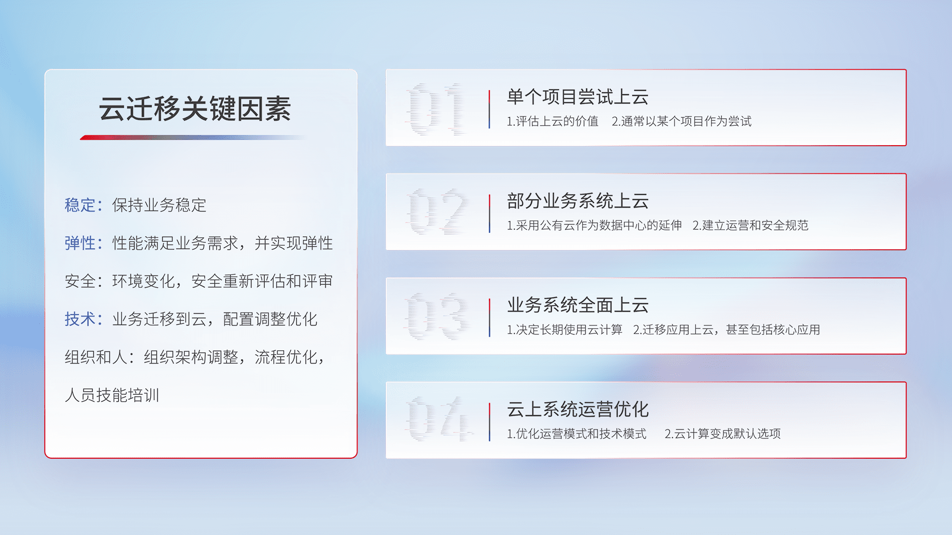 结合实际业务,,从规划设计、、云平台选型、、云原生改造、、数据迁移、、、、集成交付,,迁移全过程为客户识别最佳上云路径,,,做好风险识别管理,,,,设计网络架构、、、身份权限、、、安全审计合规、、操作审计、、日志审计、、、监控告警策略、、多站点容灾设计等,,,对云上基础设施进行整体规划,,提升IT治理水平,,,以满足弹性、、、高可用、、高性能的需求。。。。