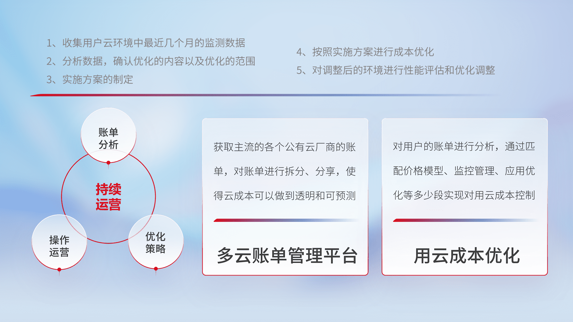通过多云纳管,,,,以统一的资源数据模型把客户的云资源进行抽象和封装,,,进而实现对多云资源的统一操作,,,,保障云资源管理的可靠性、、、稳定性与可用性。。量身定制化运维内容,,,配置、、、、开发运维、、、补丁管理、、、备份、、、、监控、、、、认证和访问管理、、审计和日常巡检等,,,保障在用云过程中的可靠度,,稳定度以及高可用率。。。。