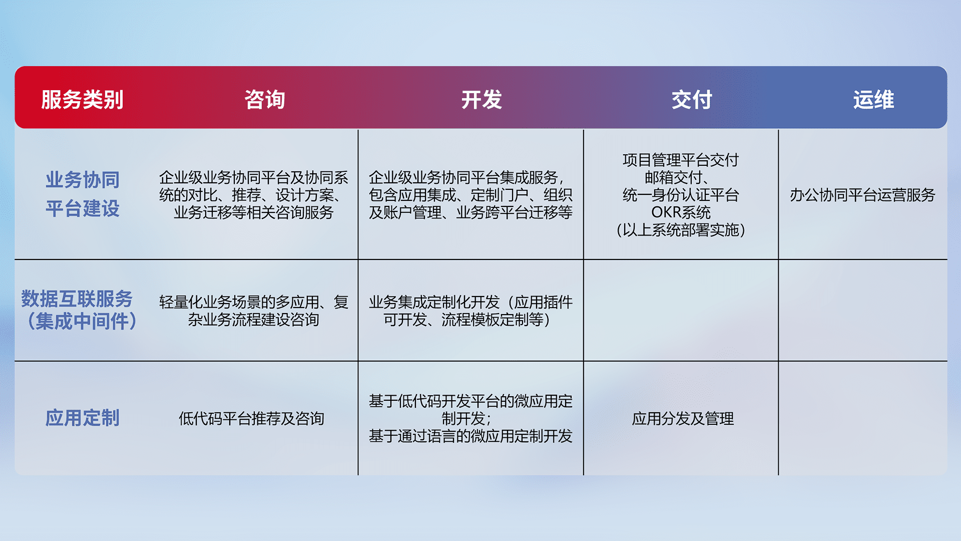 针对钉钉、、、、企微、、IDaas等平台级产品提供产品的规划、、、方案、、交付、、、定制化开发等服务,,,实现如统一协同办公、、、智能客户服务、、混合会议管理、、、、智能数据查询、、、等业务场景,,,,实现数字化转型。。